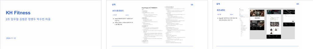 개요 헬스장 회원과 관리자가 모두 편리하게 이용할 수 있는 웹사이트를 구현하여, 회원의 등록, 예약, 환불 등 기존에 구두로 처리하던 절차를 온라인으로 전환하고, 지점과 본사에서 기구 발주, 재고, 관리 등을 일괄적으로 관리할 수 있는 효율적이고 유연한 환경을 제공